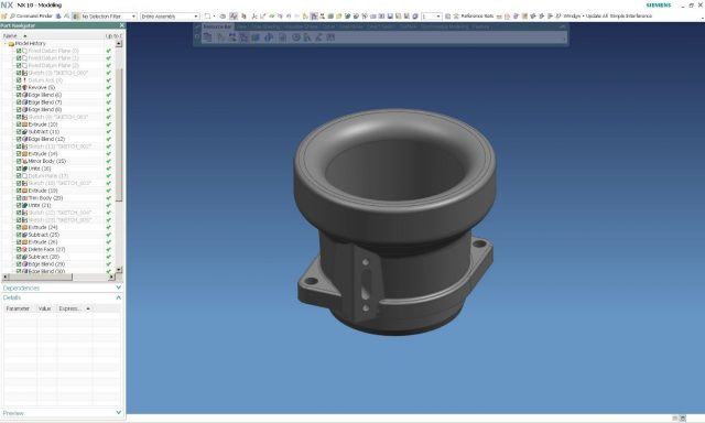Compresa l’esigenza del cliente, la prima attività svolta è stata quella della progettazione del cornetto d’aspirazione. E’ stato sviluppato il modello 3D con uno dei sistemi CAD installati in azienda e successivamente ottimizzato per l’Additive Manufacturing. Durante la fase progettuale sono stati realizzati punti di fissaggio e alloggiamenti per il sensore di temperatura.